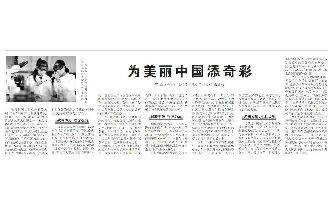 2015年5月6-8日,浙江奇彩環(huán)境科技股份有限公司派出了由市場部、研發(fā)部、工程中心組成的強大團隊參加了于上海舉行的第十六屆中國環(huán)博會。此次環(huán)博會是亞洲最具影響力、最高品質(zhì)的環(huán)境技術(shù)交流盛會,薈集了全球頂級污水處理、固體廢棄物處理、資源回收利用、大氣污染治理、室內(nèi)空氣污染治理、場地修復(fù)、環(huán)境監(jiān)測、環(huán)境服務(wù)業(yè)等環(huán)境污染治理領(lǐng)域的前沿技術(shù)與最新解決方案。