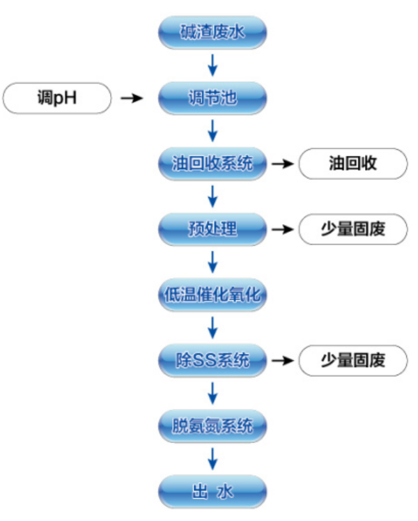 After pretreatment of alkali residue wastewater pretreatment to remove part of the COD and improve the COD can be removed, pretreatment wastewater into the low temperature catalytic oxidation system;